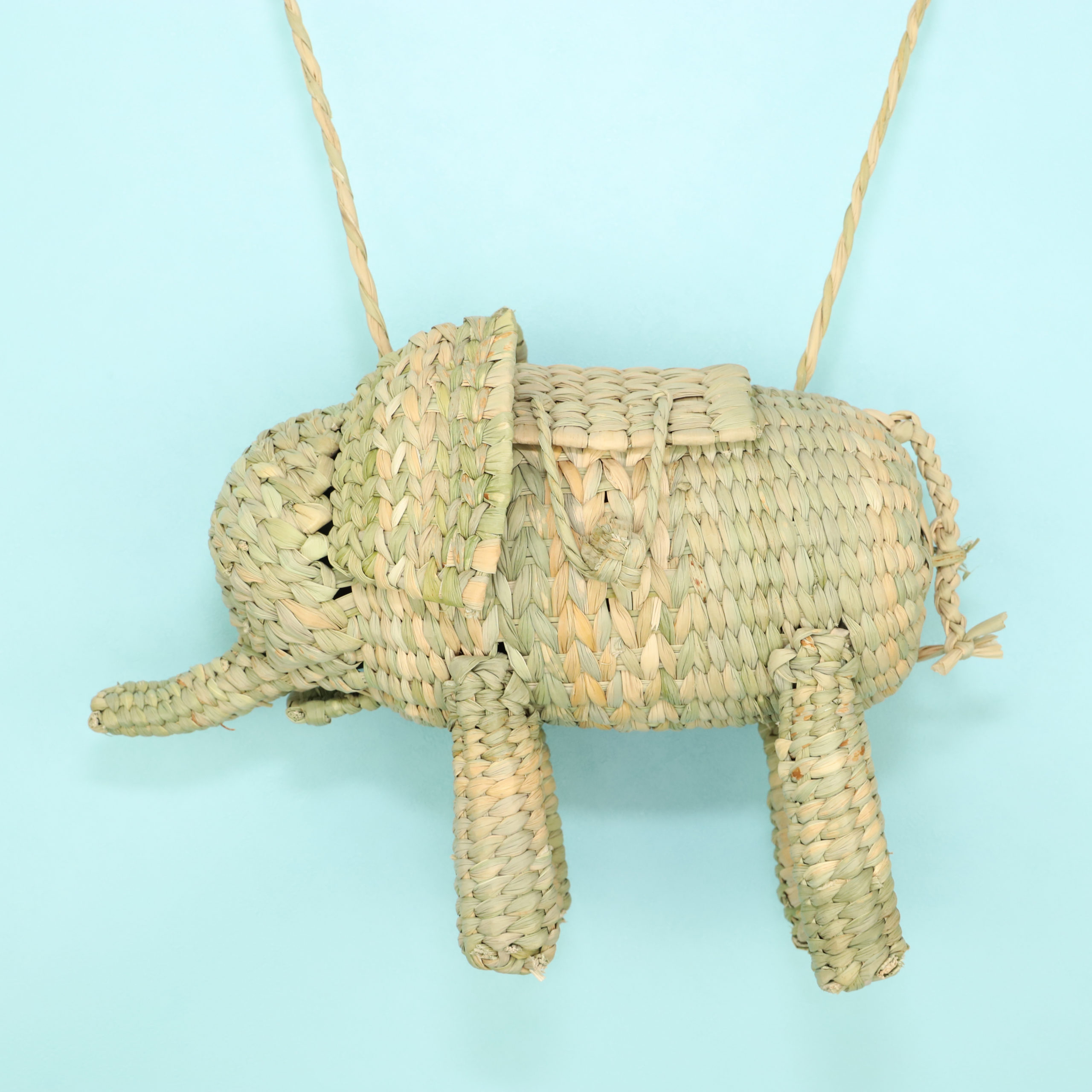 このかわいいダックスフンドの形のバッグは、メキシコの職人たちがシュロ(ヤシ)を使用してひとつひとつ手作りで編んだかごバッグです。