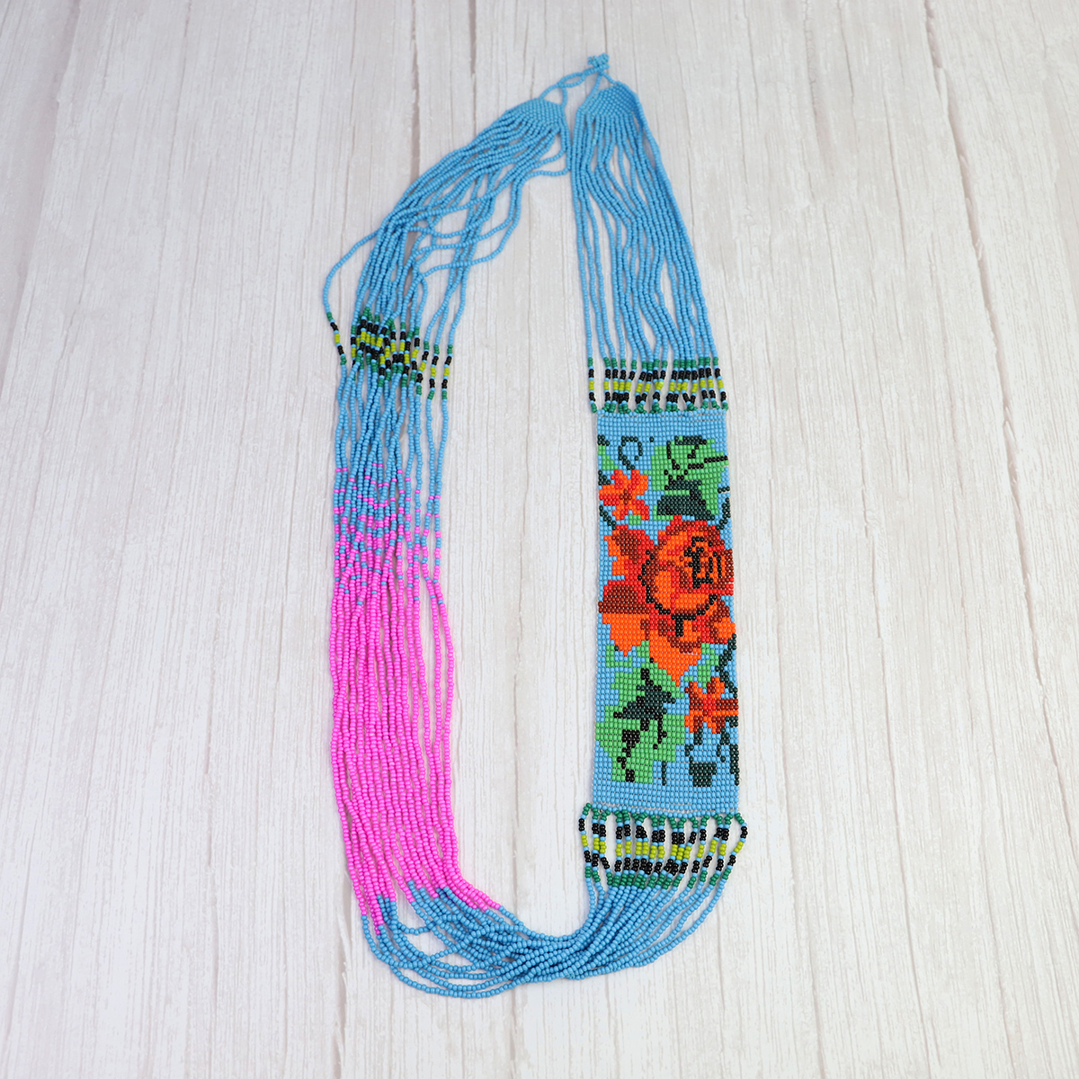 華やかなお花のビーズロングネックレス。存在感抜群なネックレスはシンプルな装いのアクセントにぴったり♪ 存在感抜群でグラデーションが美しいアートなこのネックレスはメキシコの刺繍服やシンプルな装いのアクセ…